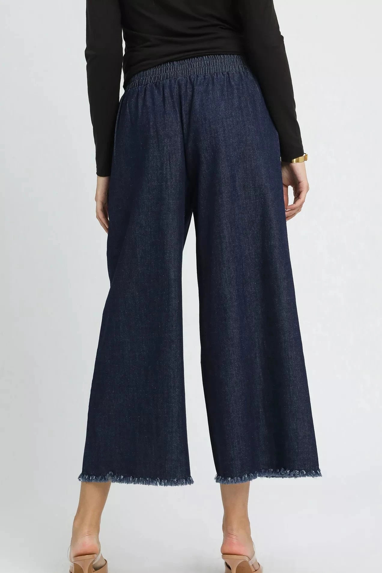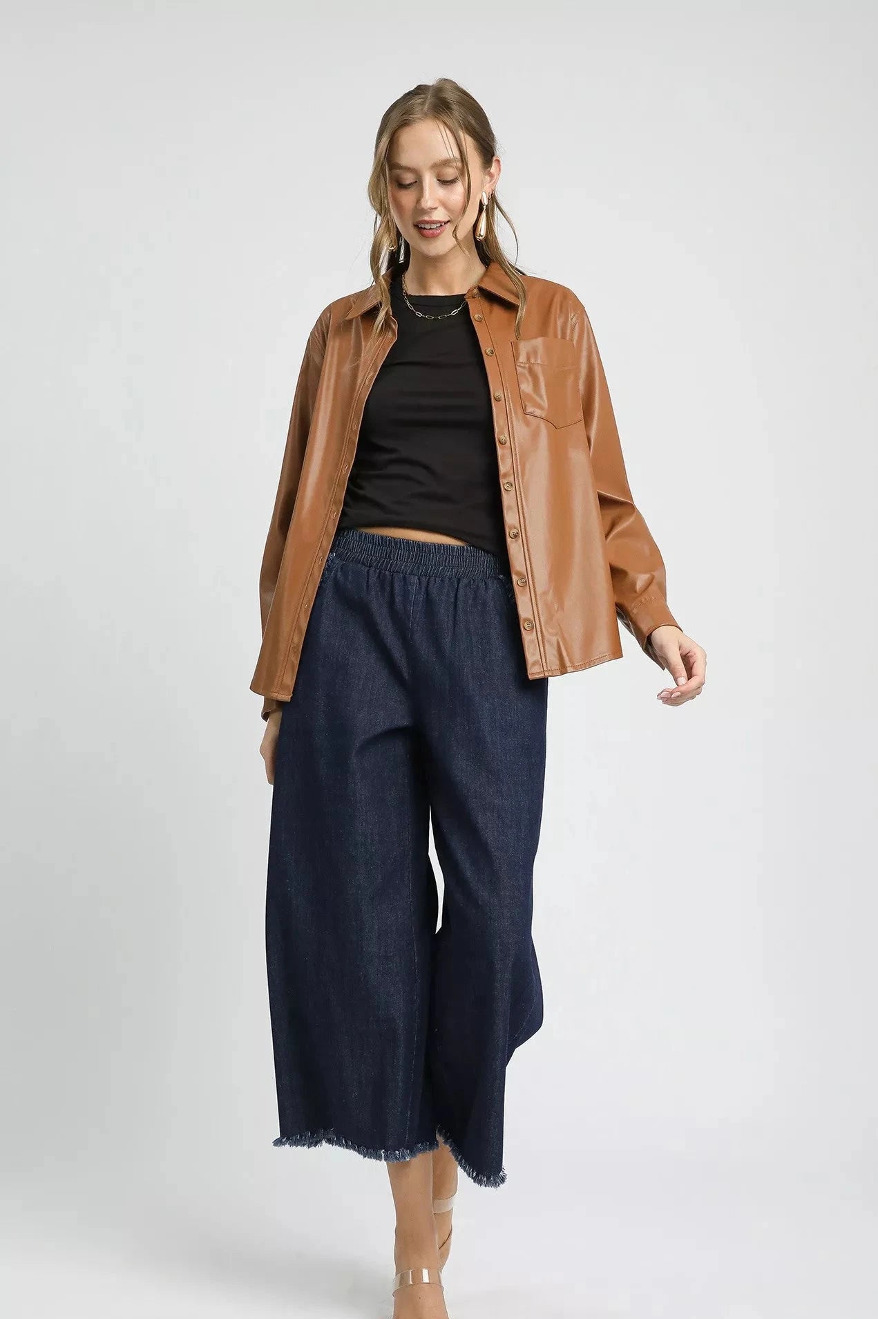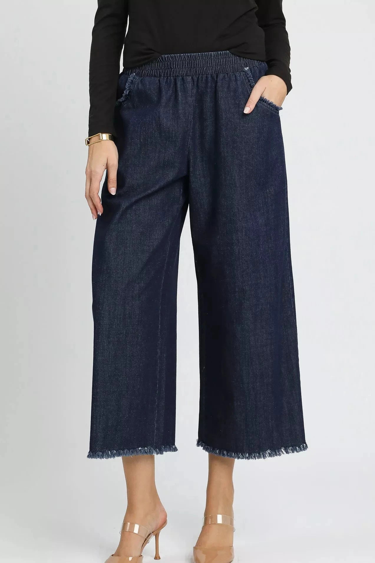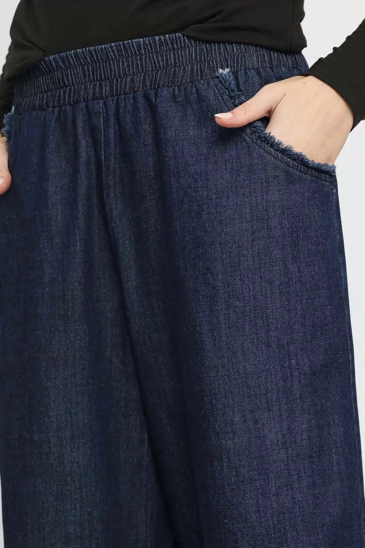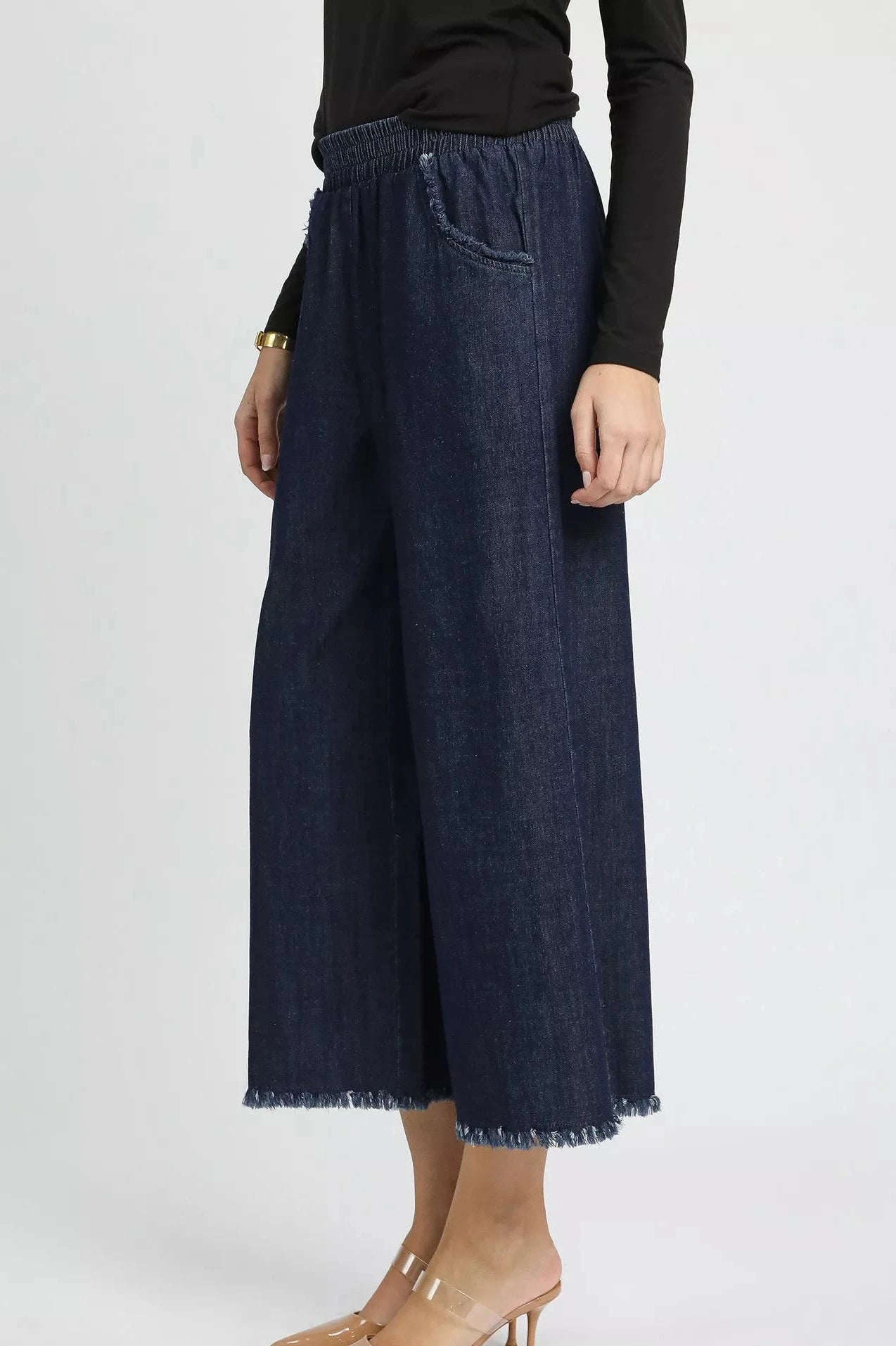 Upgrade your denim collection with these dark wash fringe hem wide leg jeans. Crafted from durable cotton-blend denim, these jeans feature a relaxed silhouette with an elastic waistband for maximum comfort and ease. The cropped wide leg adds a contemporary twist, while the raw fringe hem and frayed pocket edges give it a modern, lived-in look. Perfect for pairing with fitted tops, blouses, or casual sweaters, these jeans transition seamlessly from day to night. Whether youโre dressing up with heels or keeping it casual with sneakers, they bring style and comfort together effortlessly.