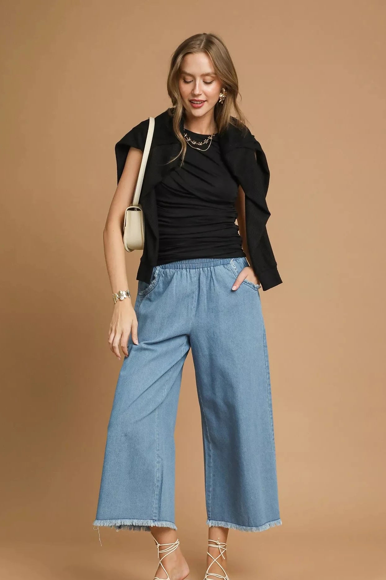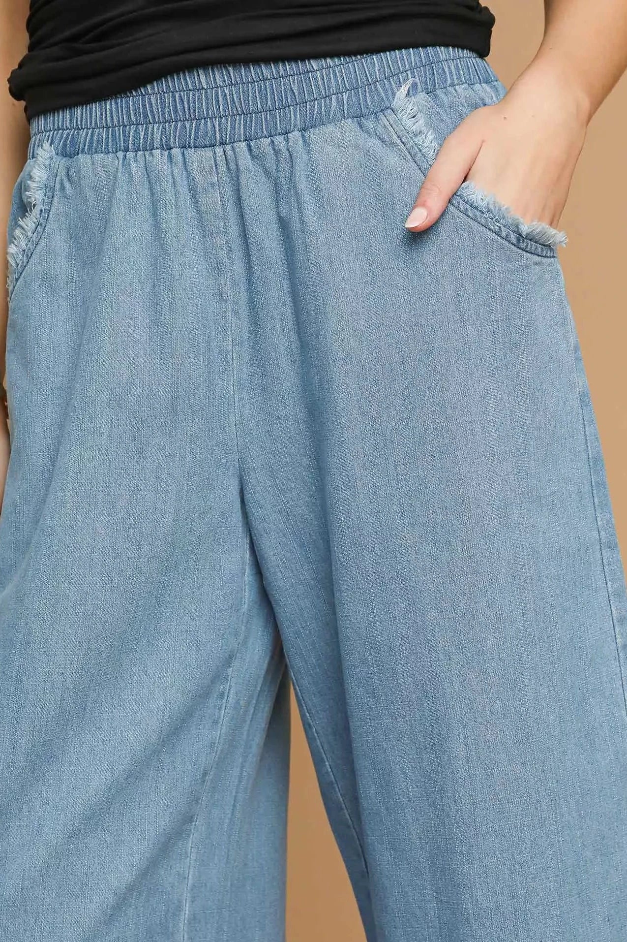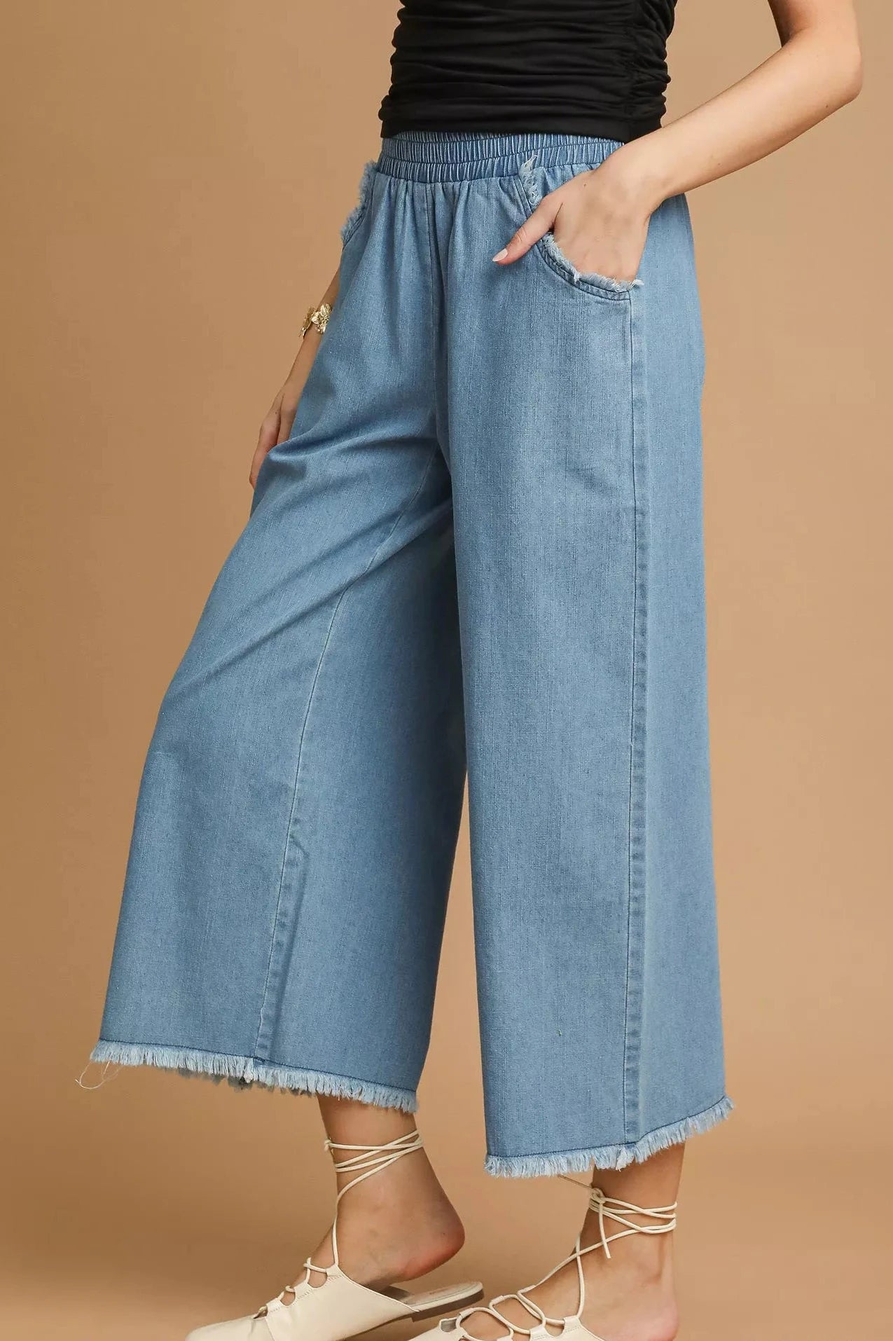 Step into relaxed style with these light wash fringe hem wide leg jeans. Designed with a comfortable elastic waistband and a cropped, wide-leg silhouette, these jeans combine ease with a laid-back modern edge. The soft, lightweight denim features a washed finish for a worn-in look, while frayed pocket edges and raw hems add a touch of casual charm. Perfect for warm-weather days or travel, these jeans can be dressed up with heels and a blouse or styled down with sandals and a tank for an effortlessly chic ensemble.