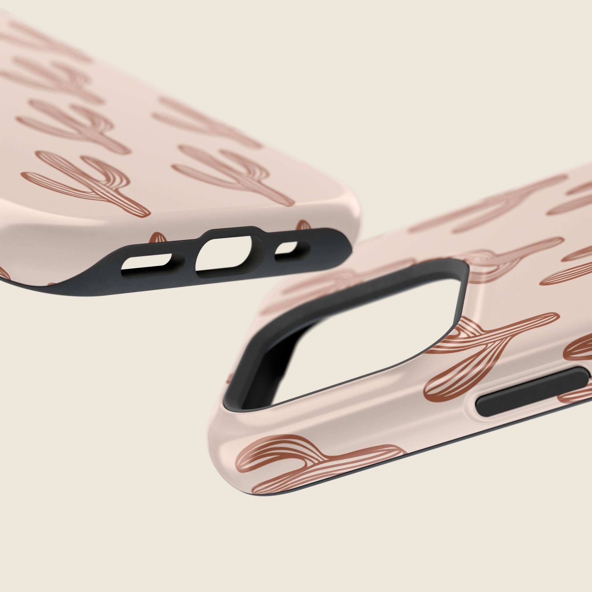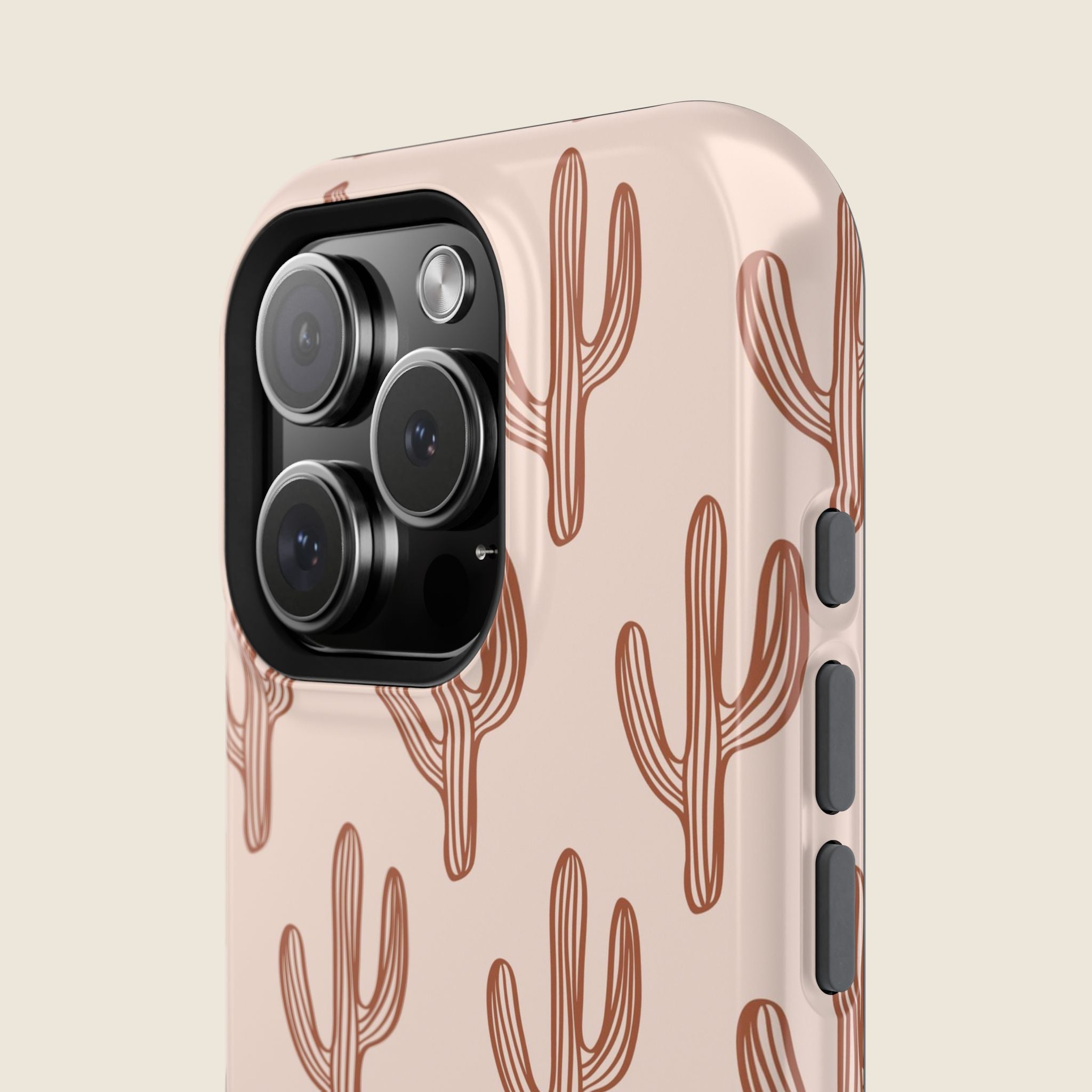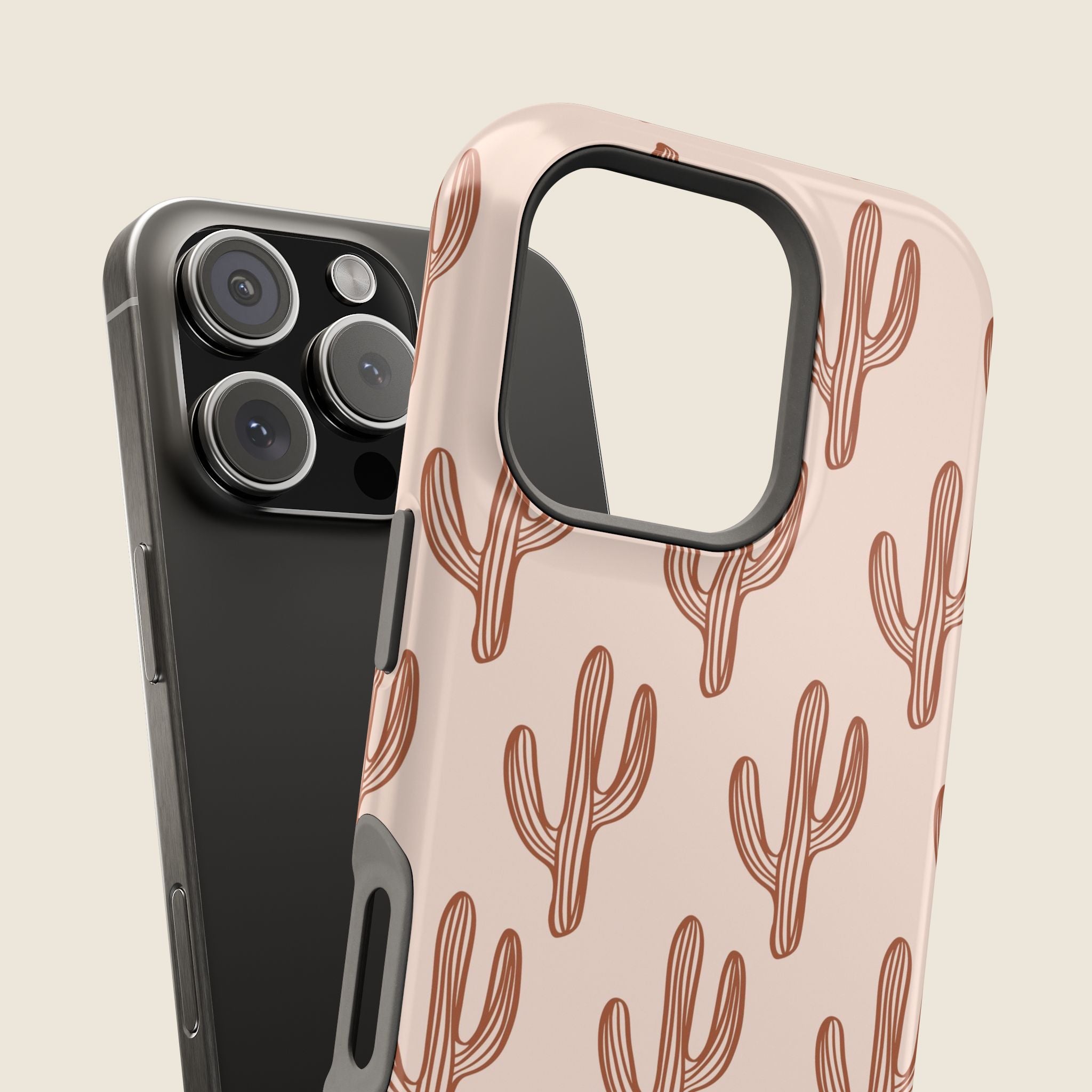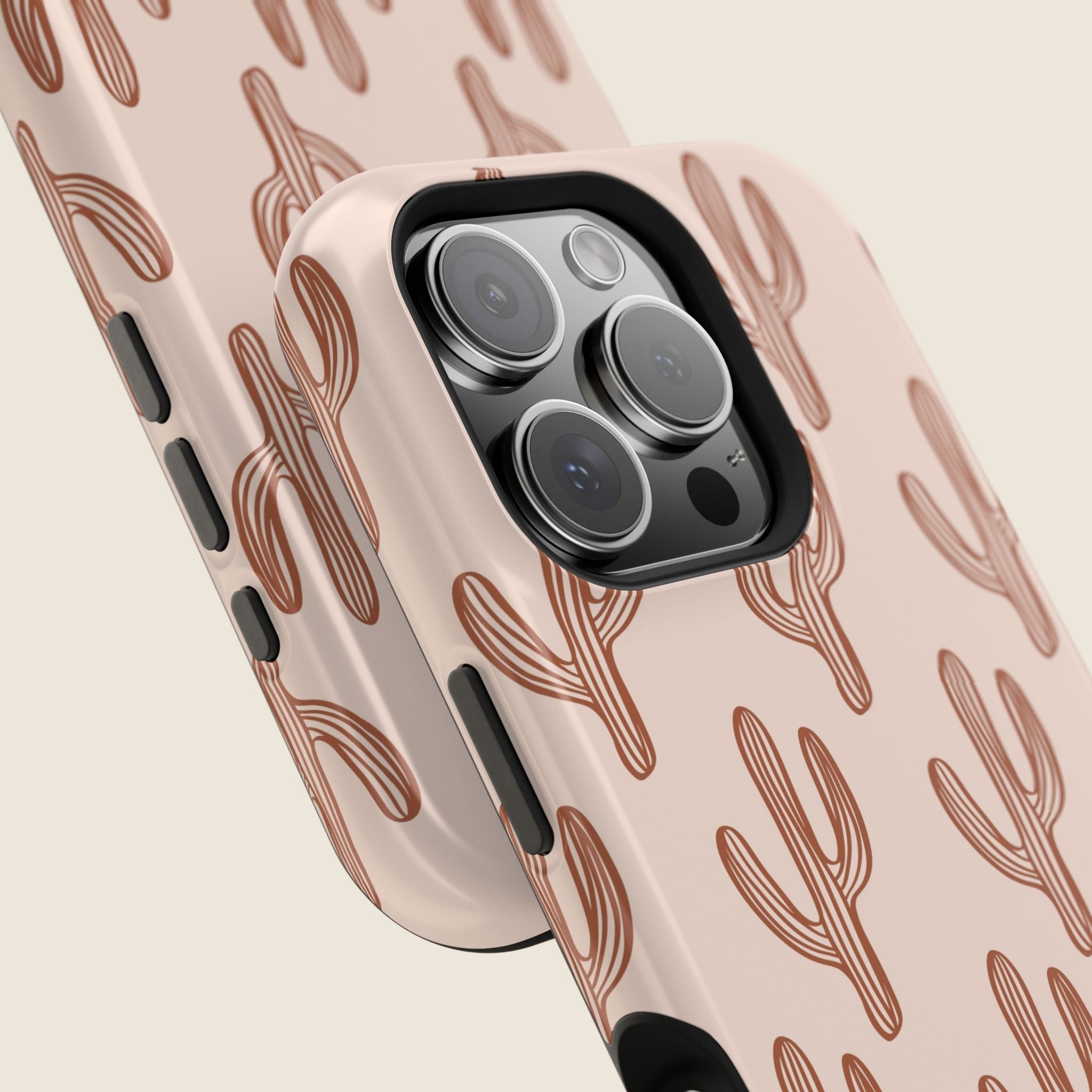 Bring subtle western charm to your everyday look with this blush pink cactus iPhone case. Designed with a clean, minimalist print of terracotta-colored cacti across a soft blush background, this case is perfect for fans of desert vibes and simple, bold style. The full-wrap design ensures the pattern stands out from every angle, while the dual-layer construction keeps your phone protected through daily wear. MagSafe® compatibility and a choice of matte or glossy finish add extra versatility and function.