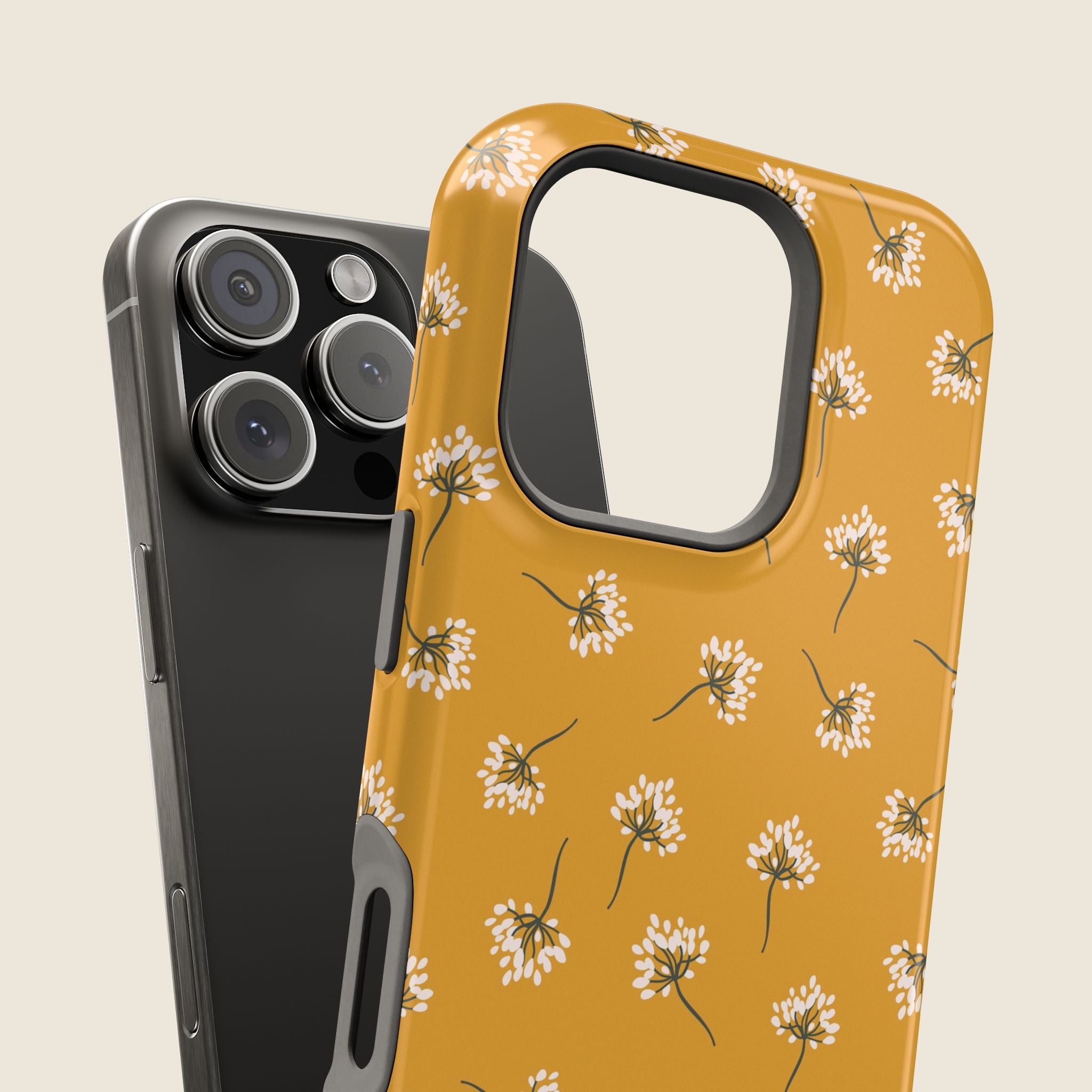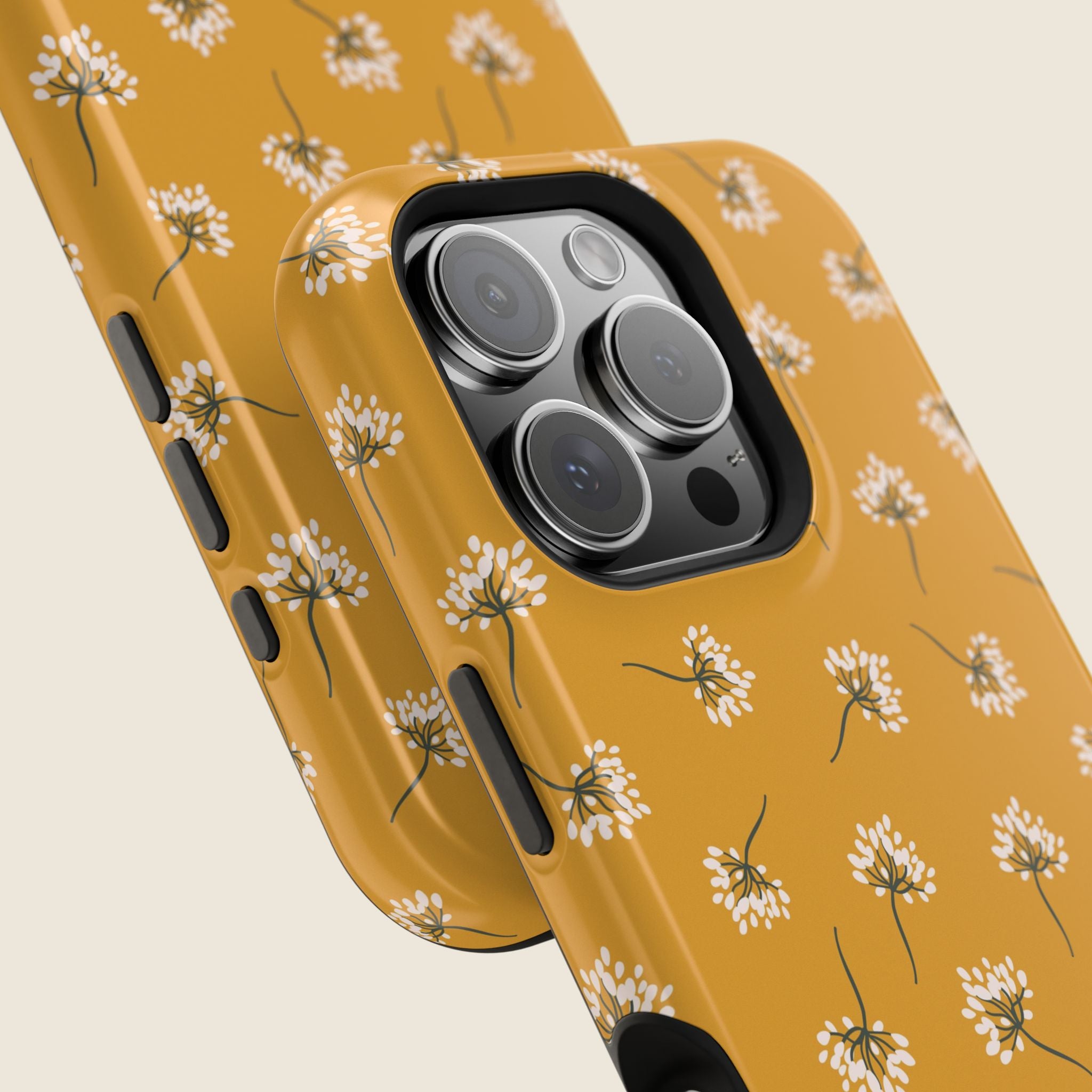 Add a cheerful pop of color and charm to your phone with this Mustard Yellow Wildflower iPhone Case. Featuring a minimalist pattern of white wildflowers with slender green stems scattered across a rich mustard background, this case blends playful botanical aesthetics with everyday practicality. Its vibrant full-wrap print makes a bold statement, while the MagSafe-compatible dual-layer build ensures superior protection and ease of use. Choose between a glossy or matte finish to perfectly match your personal style.