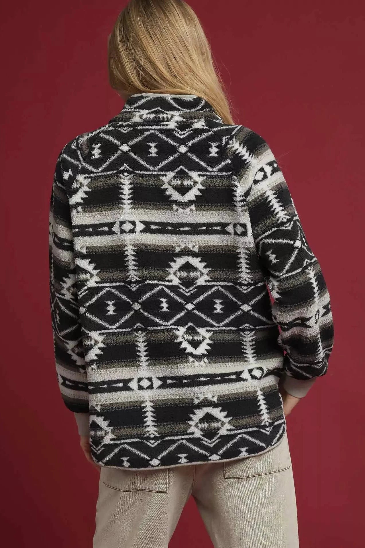 Black and Grey Aztec Sherpa Pullover with Quilted Button Detail