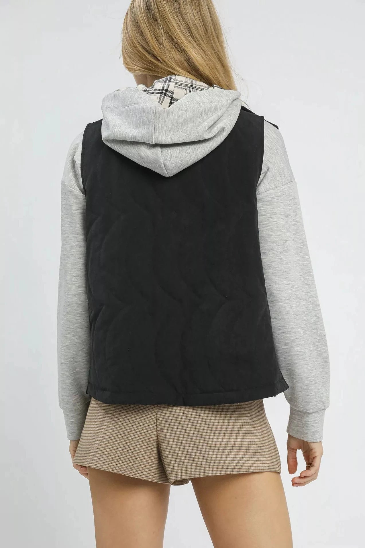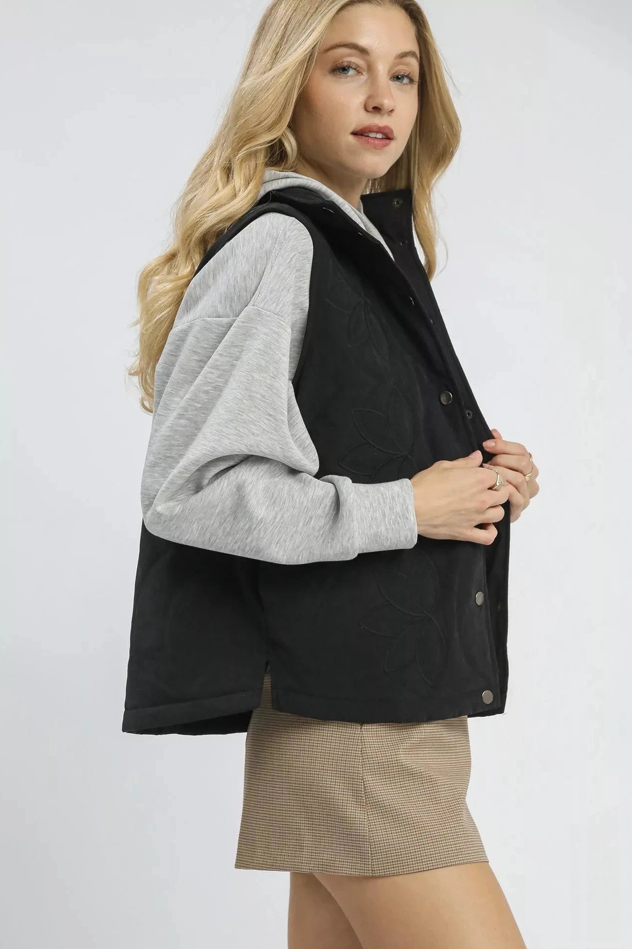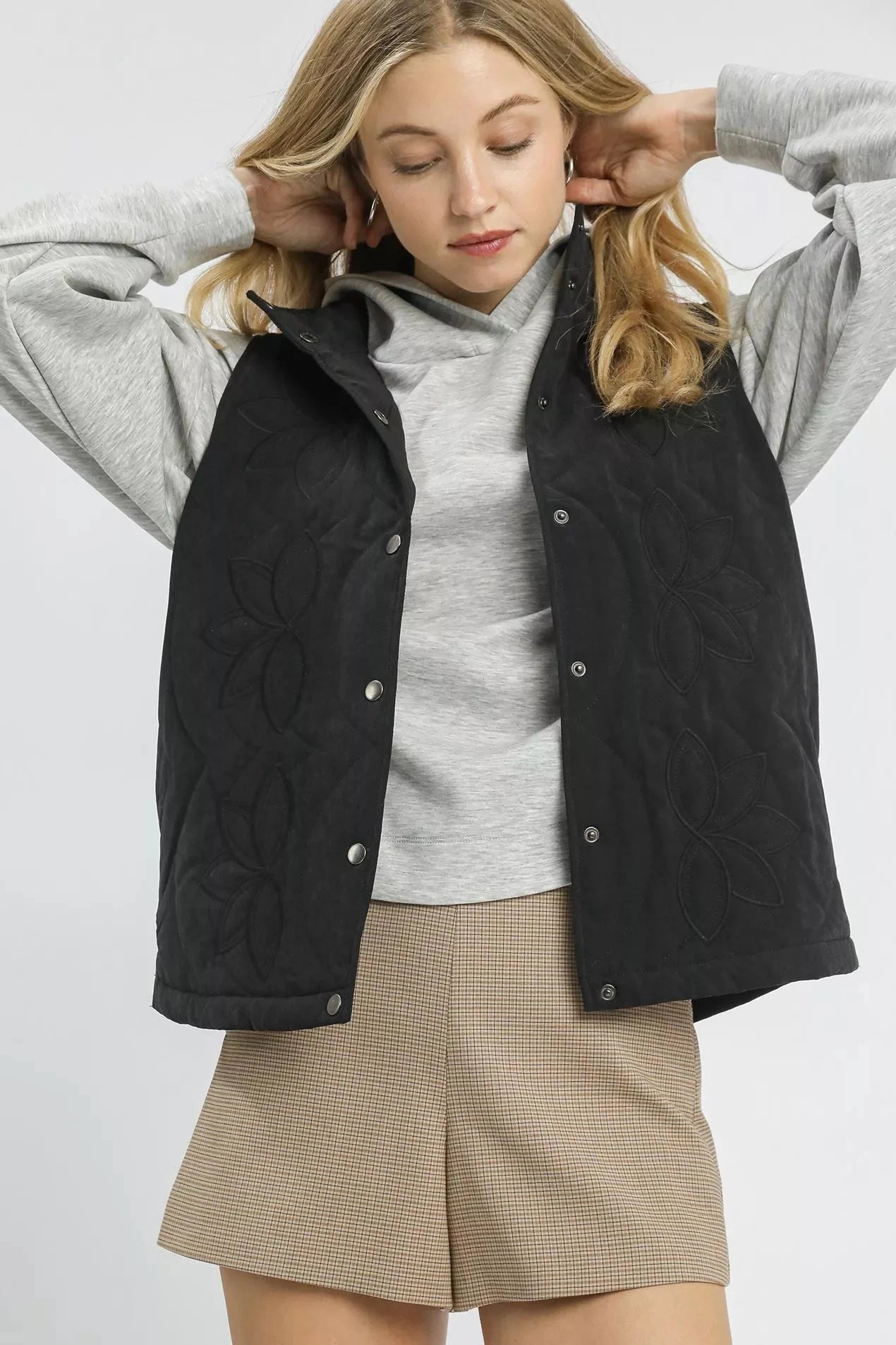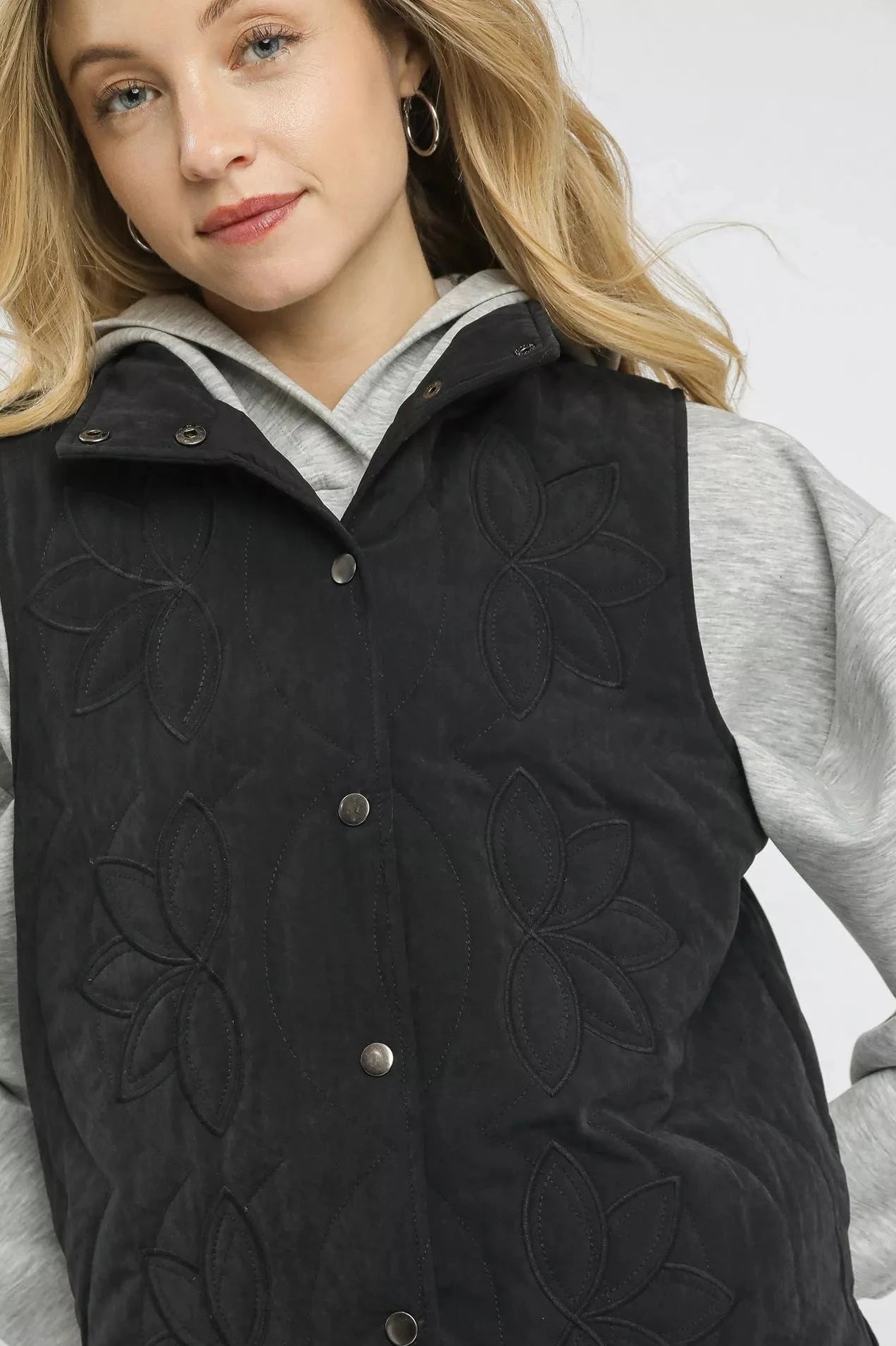 Elevate your outerwear collection with this chic Black Quilted Embroidered Vest, designed for warmth and effortless layering. The soft quilted fabric features subtle floral stitching that adds texture and dimension to your look, while the high stand collar and snap button front deliver both practicality and polish. Perfectly balanced between cozy and lightweight, this vest layers beautifully over hoodies, sweaters, or long sleeves. Its sleeveless silhouette and side slit hem make it an ideal transitional piece for fall through early spring.