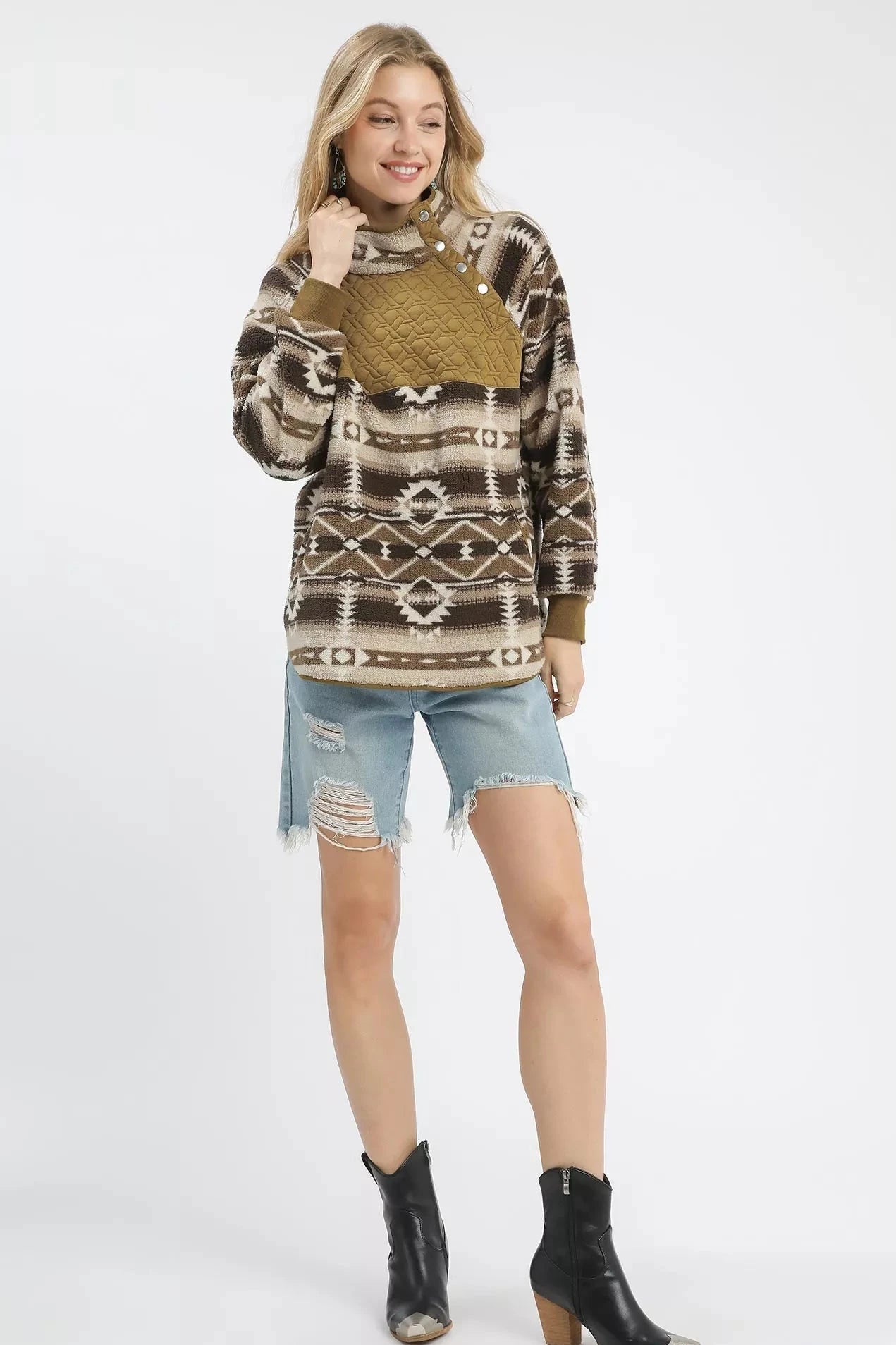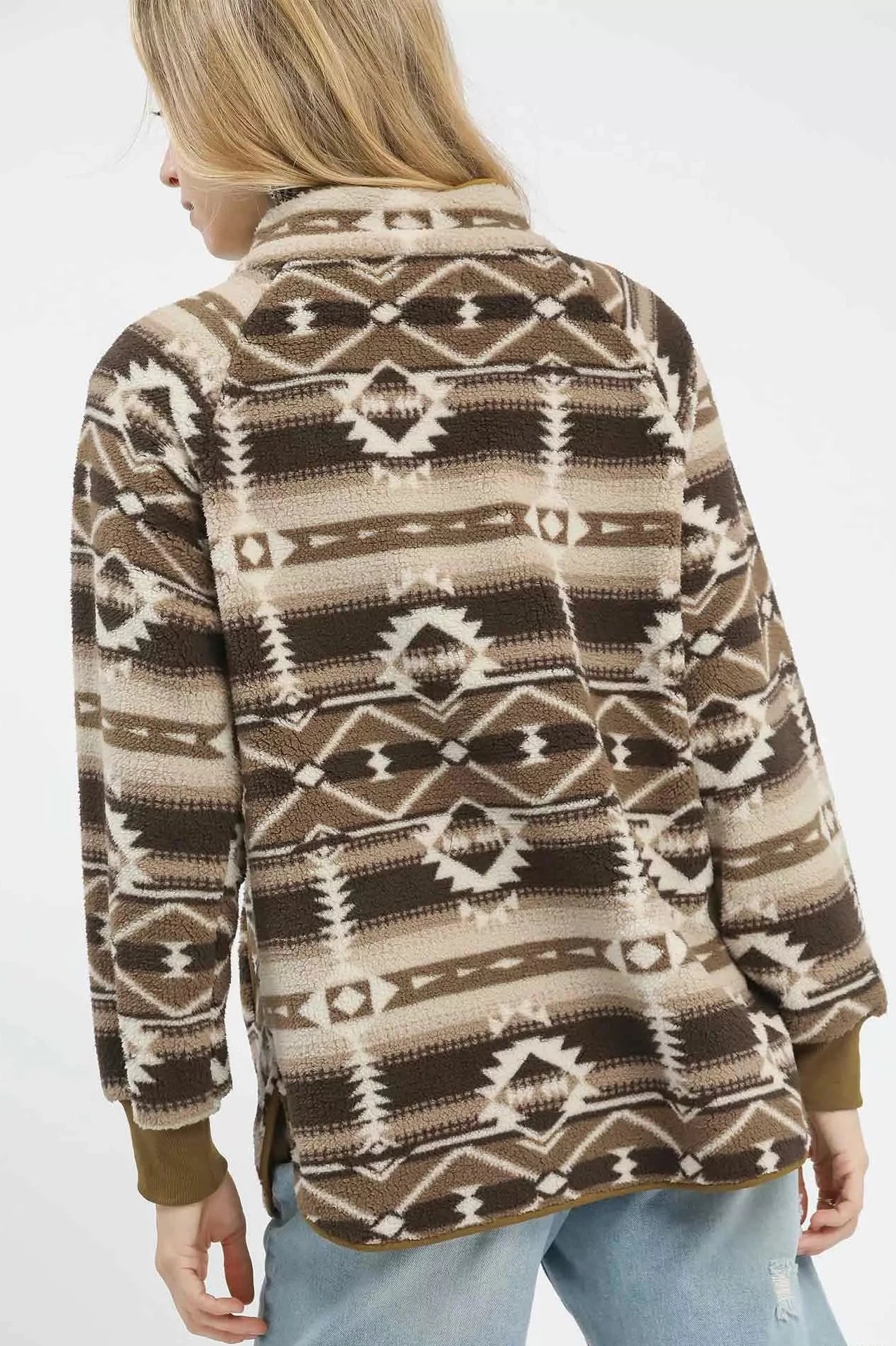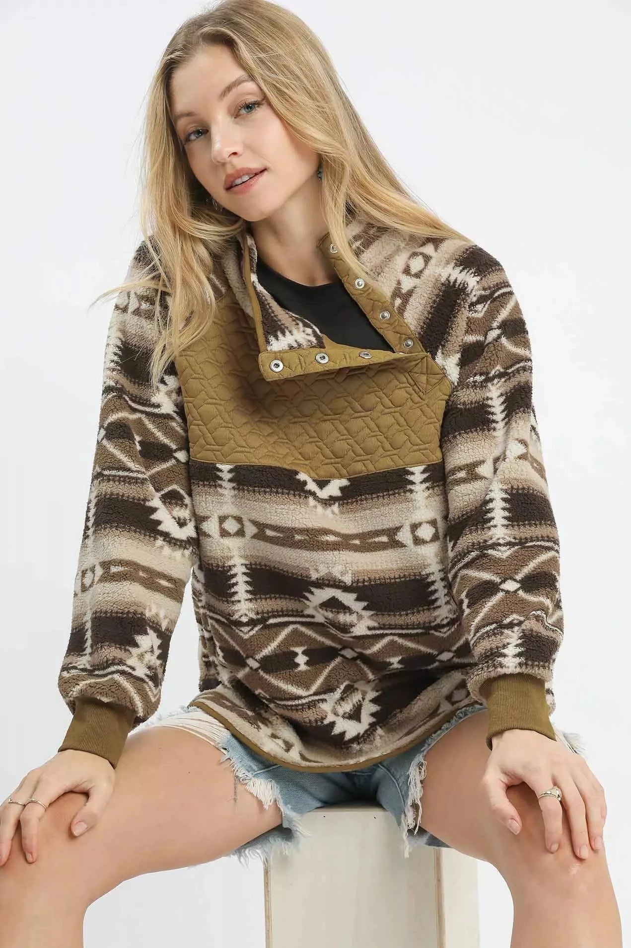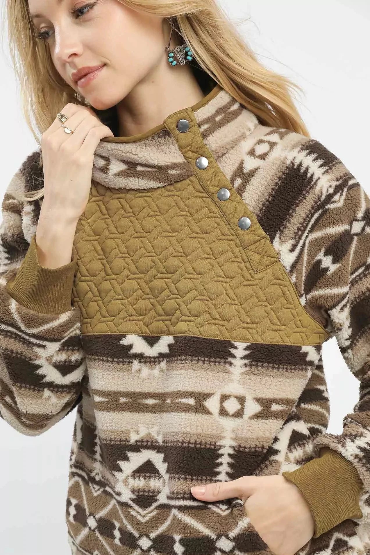Brown Aztec Sherpa Pullover with Quilted Button Neck Detail