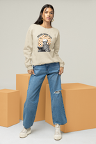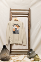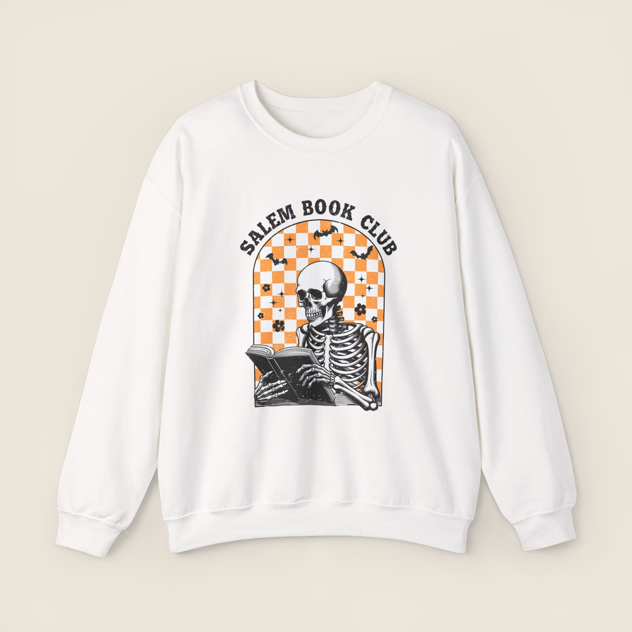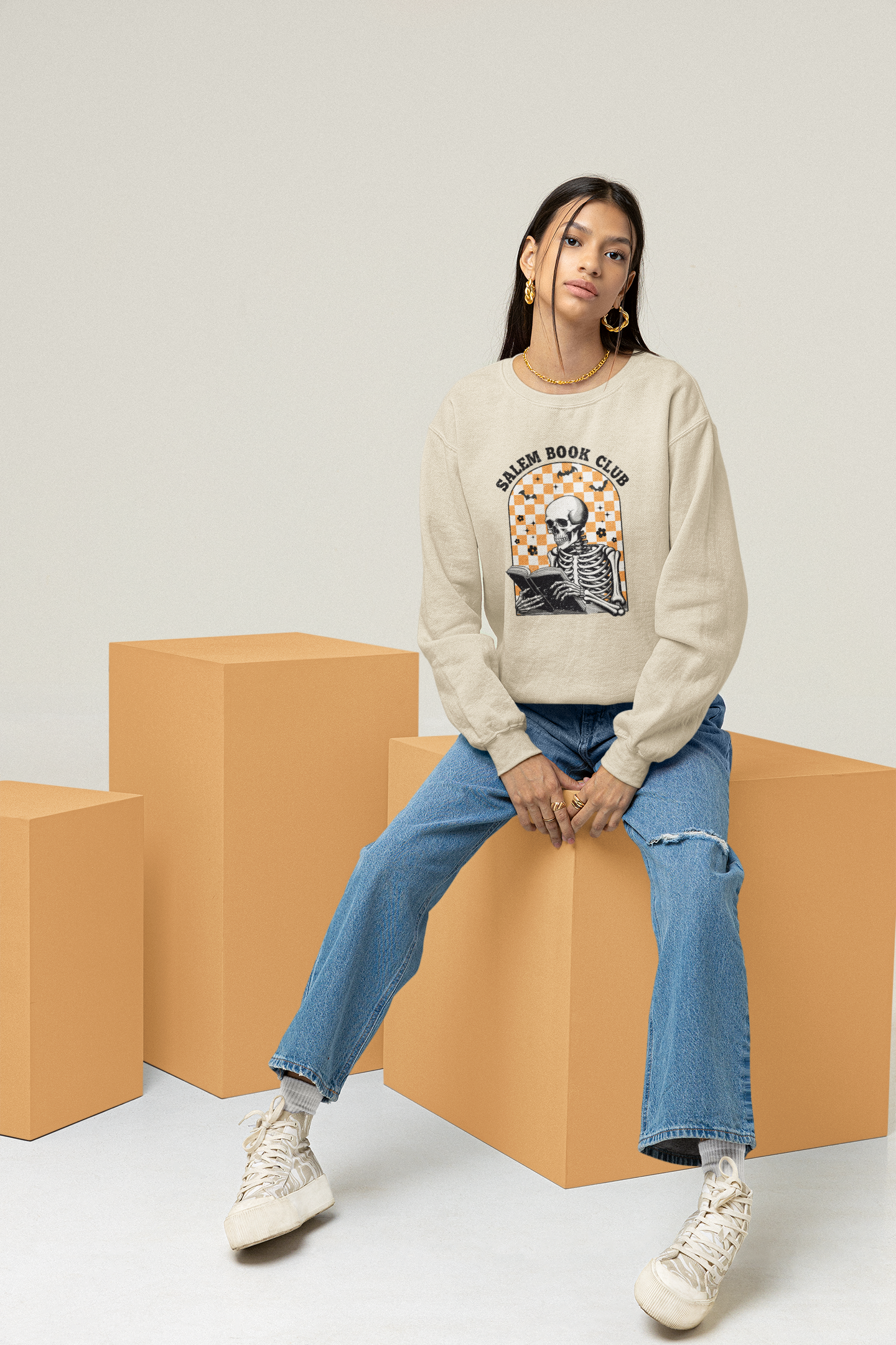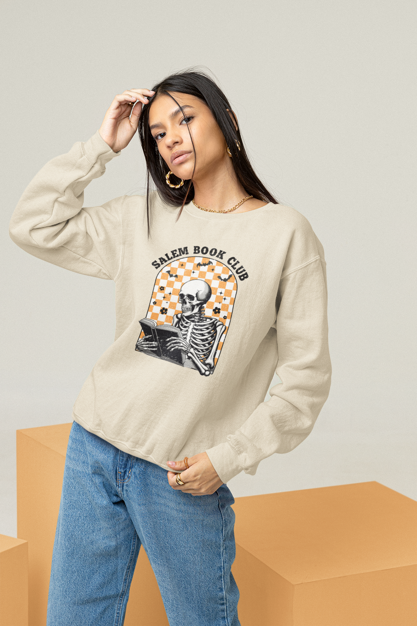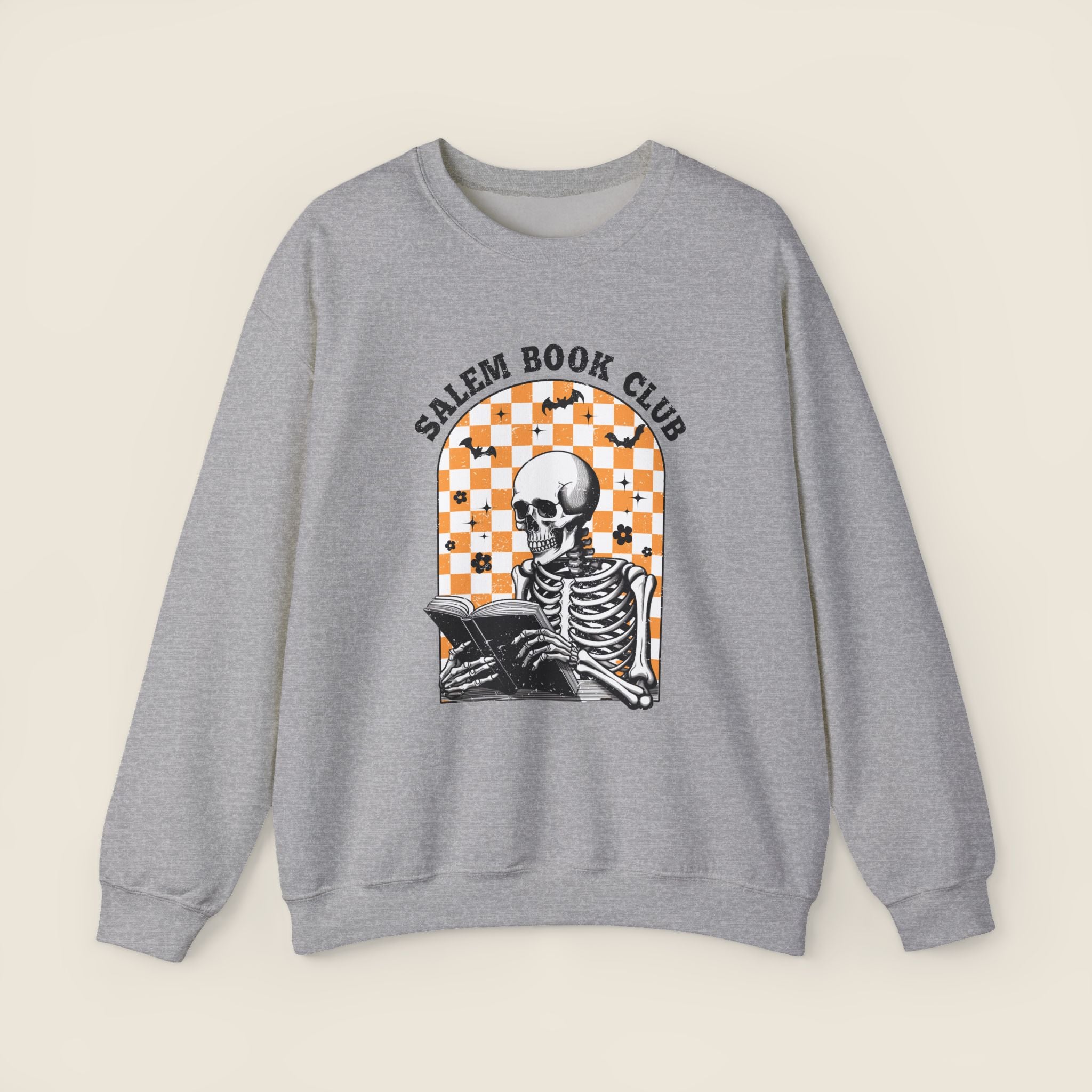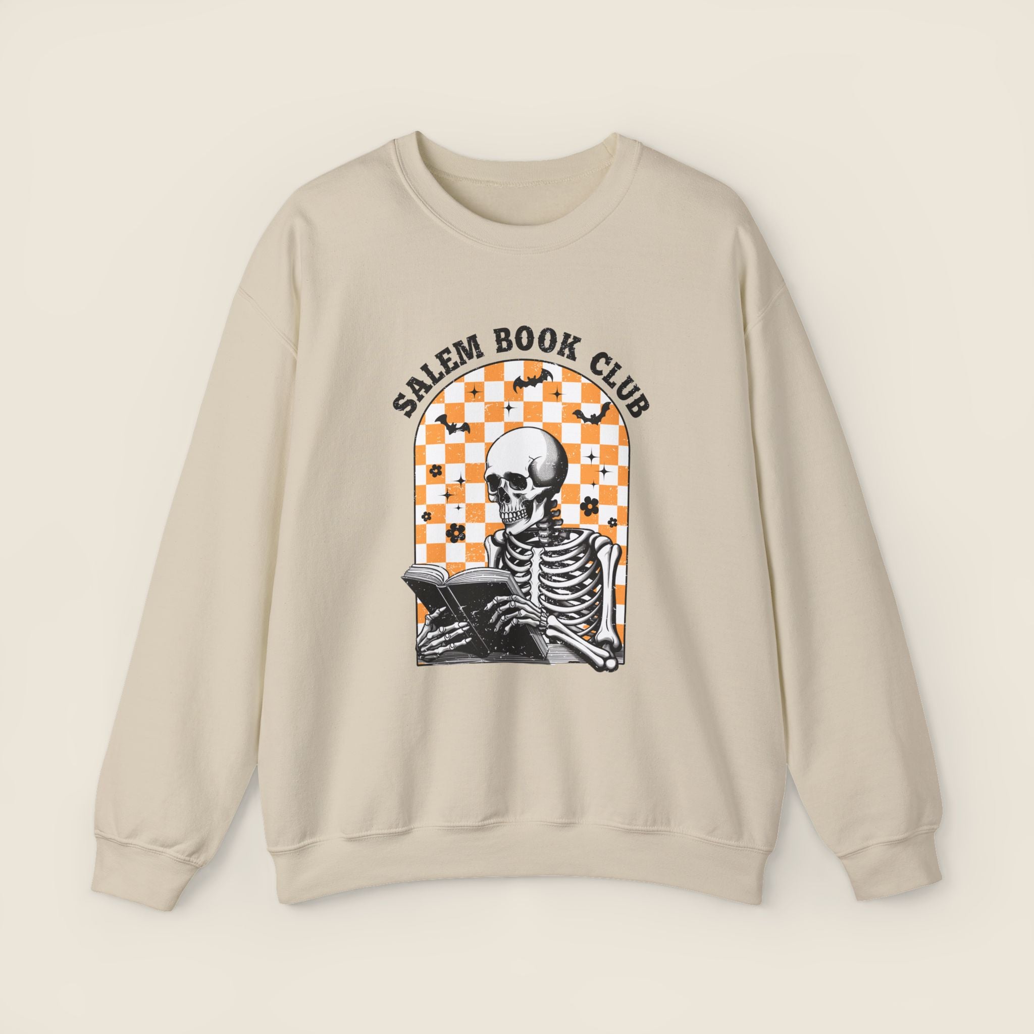 Beige sweatshirt with “Salem Book Club” skeleton graphic