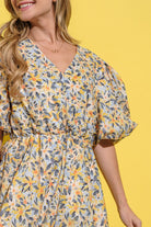 Yellow and Blue Floral Surplice Puff Sleeve Dress