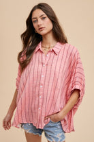 The Pink Striped Button-Up Half Sleeve Shirt is the perfect blend of relaxed style and everyday comfort. Designed with a classic button-up front, half sleeves, and a high-low hem, this top is effortlessly chic and ideal for warm-weather dressing. The subtle striped pattern adds a stylish touch, making it easy to pair with denim, shorts, or linen pants for a polished yet laid-back look.