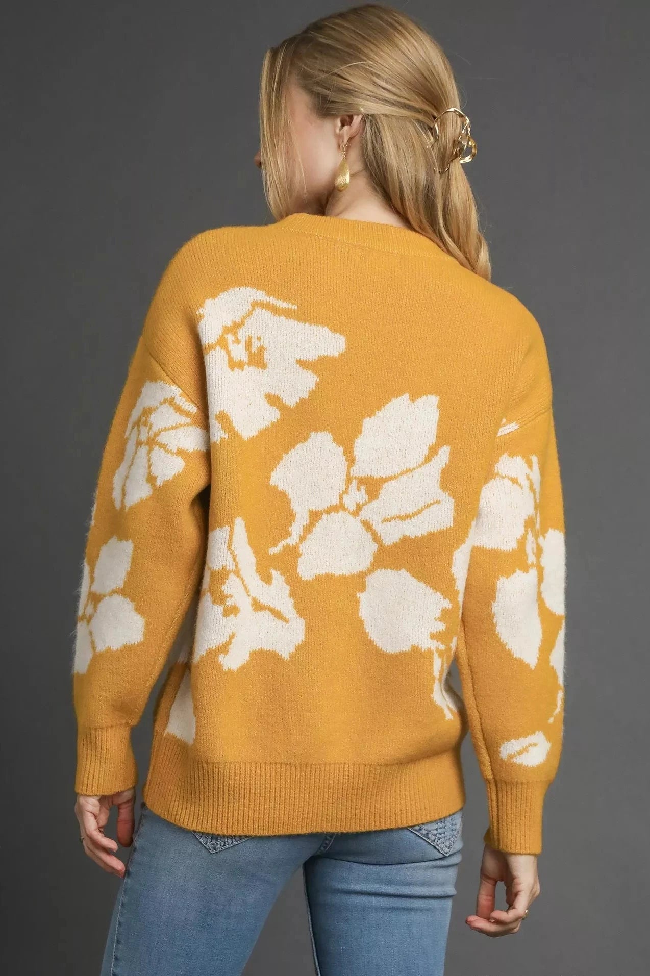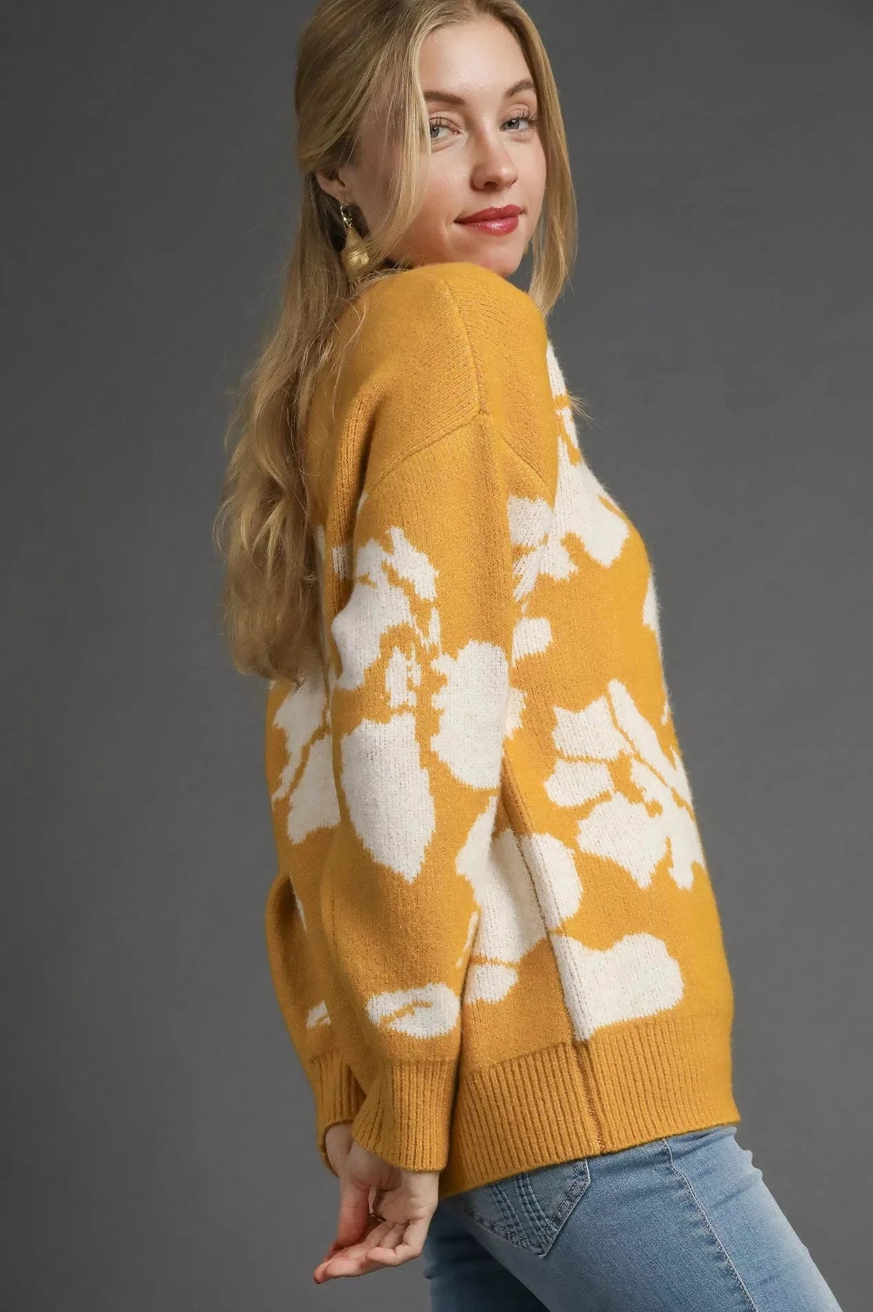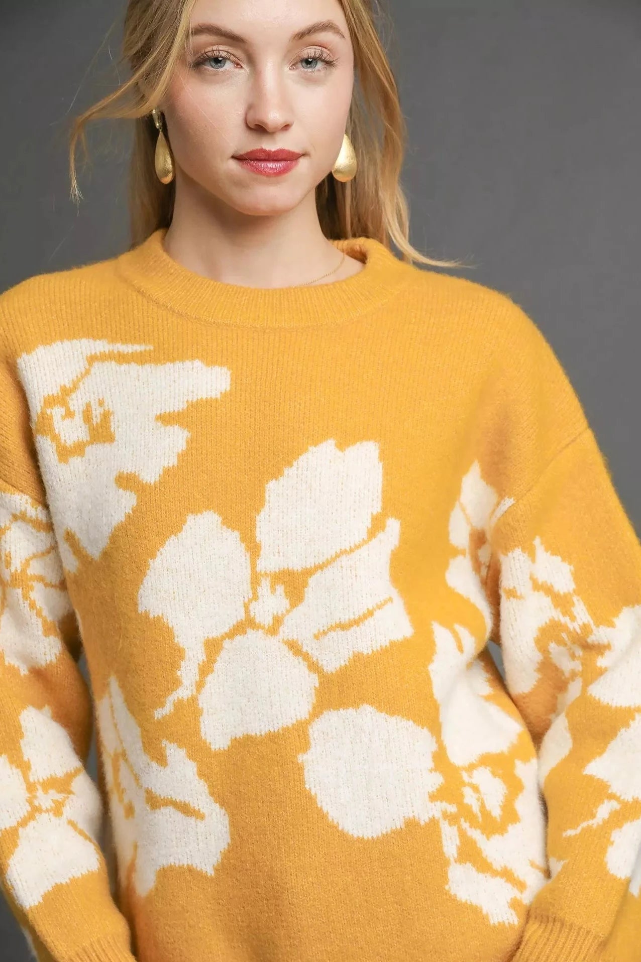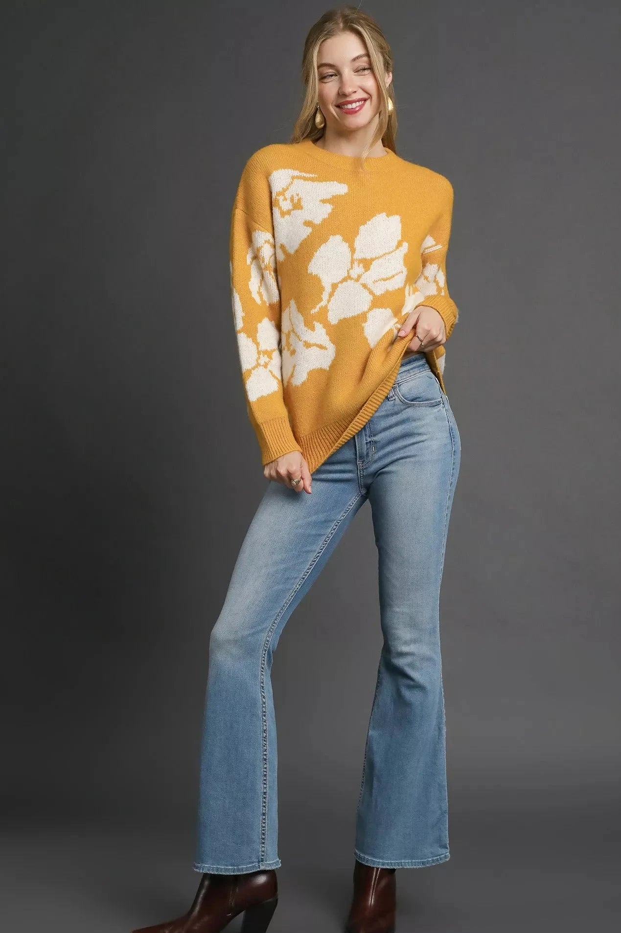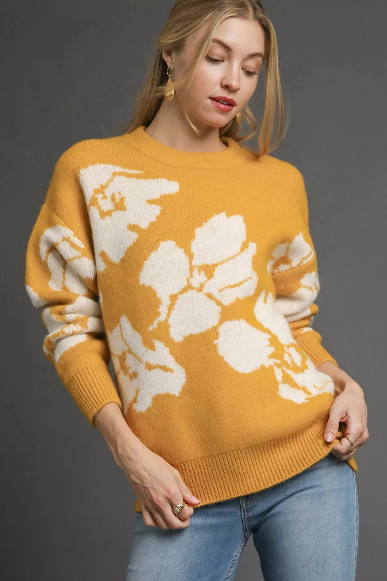 Brighten up chilly days with this mustard and cream floral long sleeve sweater. Featuring a bold oversized floral pattern, this sweater brings a touch of elegance and playful charm to any casual outfit. The soft, slightly stretchy knit blend offers cozy comfort while maintaining its shape, making it ideal for layering or wearing solo. With a relaxed, oversized silhouette and ribbed trim at the neckline, cuffs, and hem, this piece is both flattering and effortlessly stylish. Pair it with jeans, trousers, or skirts for an easy fall-to-winter look that stands out with warmth and sophistication.