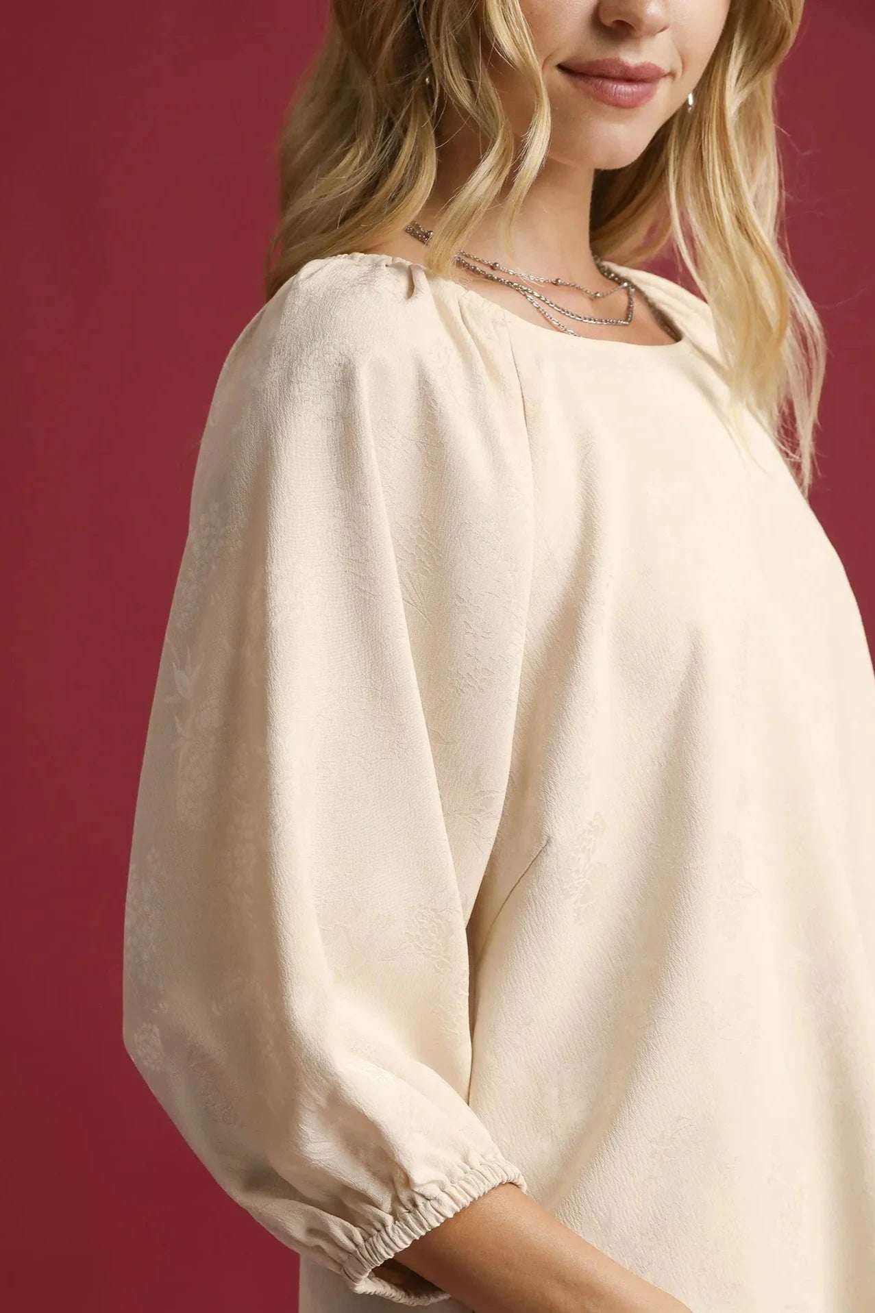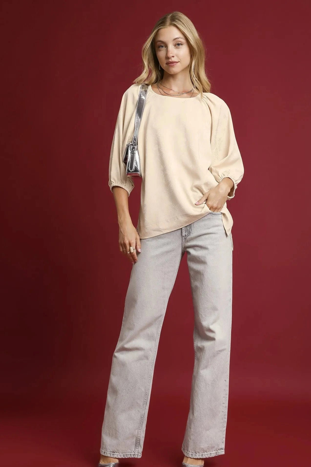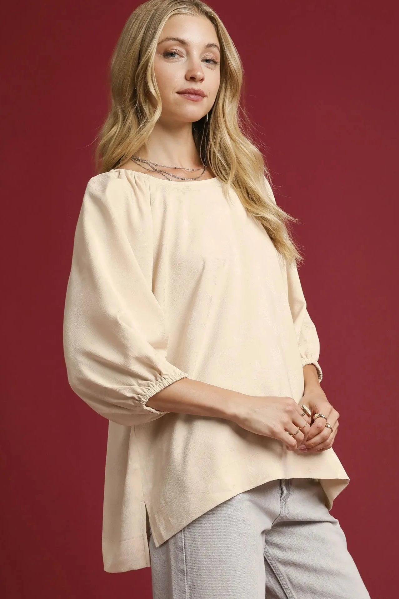 Elevate your everyday wardrobe with the Champagne Oversized Balloon Sleeve 3/4 Blouse—a refined essential designed for comfort and ease. This relaxed fit top is crafted from a soft, slightly stretchy fabric that drapes beautifully while offering breathable wear. Featuring voluminous three-quarter balloon sleeves gathered with elastic cuffs, it delivers on-trend style without compromising comfort. The round neckline and subtle side slits enhance the flowy silhouette, making this neutral-toned blouse perfect for dressing up or down. Pair it with denim, trousers, or skirts for a look that moves effortlessly from day to night.
