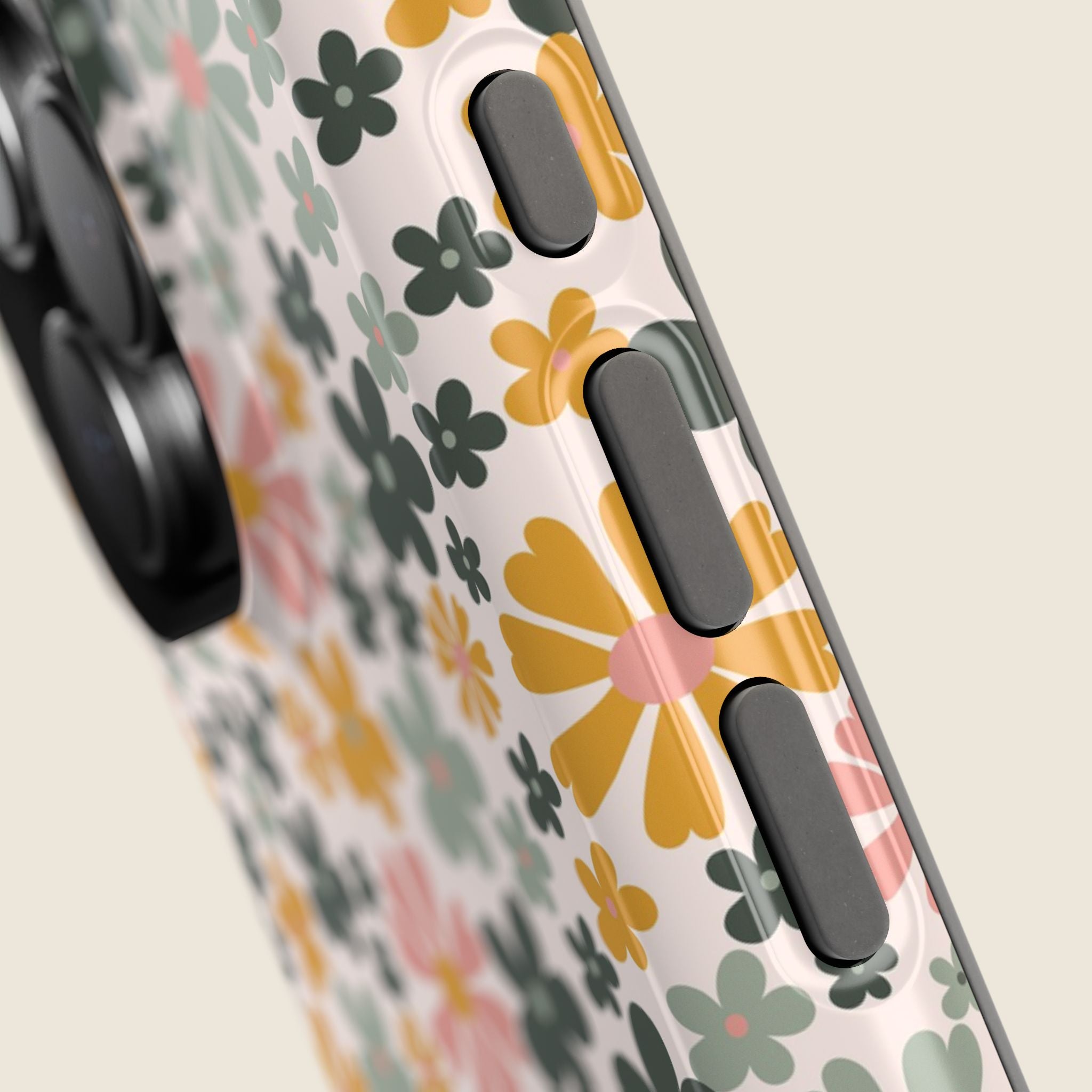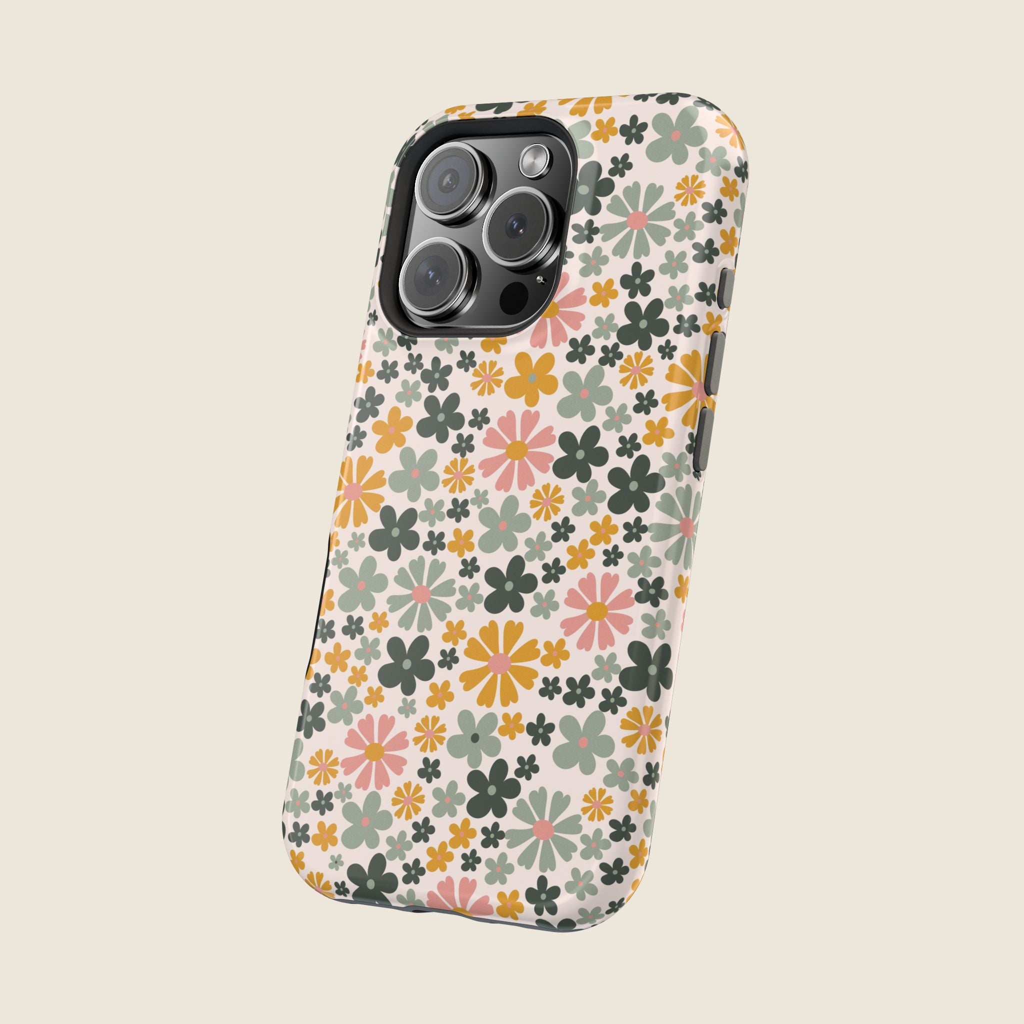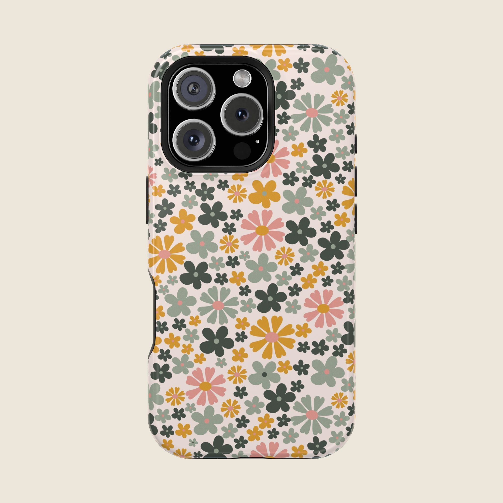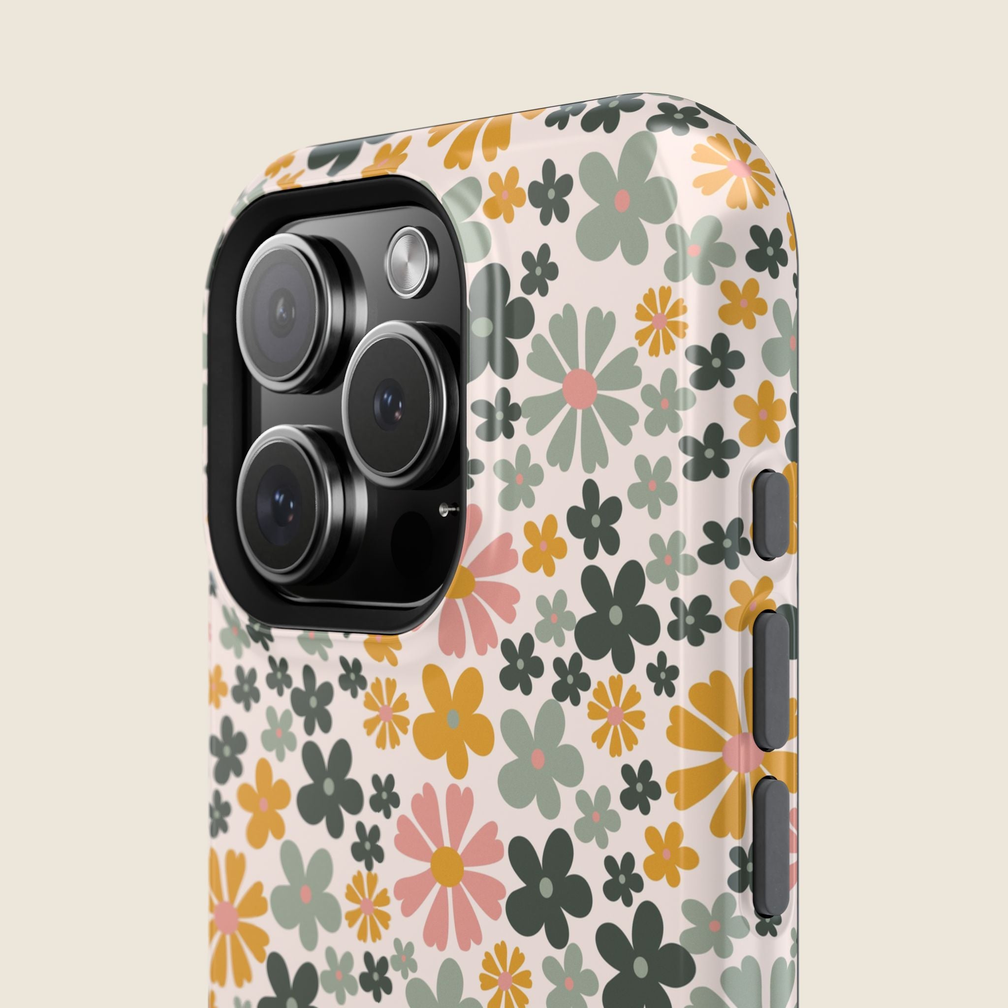 Channel vintage vibes with this retro multicolor floral iPhone case, designed for both style and durability. Featuring a playful 70s-inspired pattern of daisies and wildflowers in mustard yellow, soft pink, sage green, and forest green on a cream background, this case turns your phone into a nostalgic statement piece. The bold full-wrap print pairs perfectly with your favorite boho outfits, while the impact-resistant dual-layer design keeps your device protected. With MagSafe® compatibility and a choice of matte or glossy finish, it’s the ultimate fusion of fun and function.